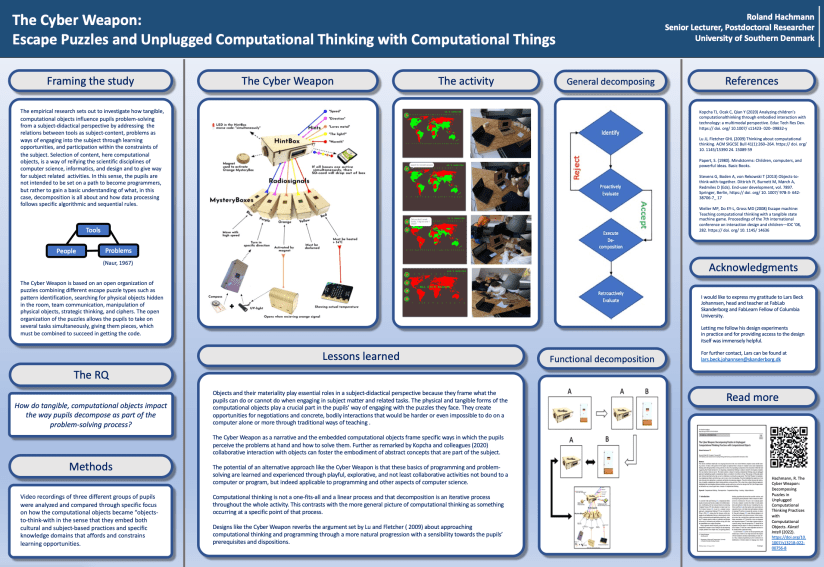 This year I had the pleasure of attending Fablearn Europe with a poster presentation of my work. The presentation highlighted the potential of Educational Puzzles in Computer Science education. Drawing on some of my empirical work, I highlighted how tangible computational things, hold the potential for learning the basics of problem-solving, decomposition, and algorithmic thinking.