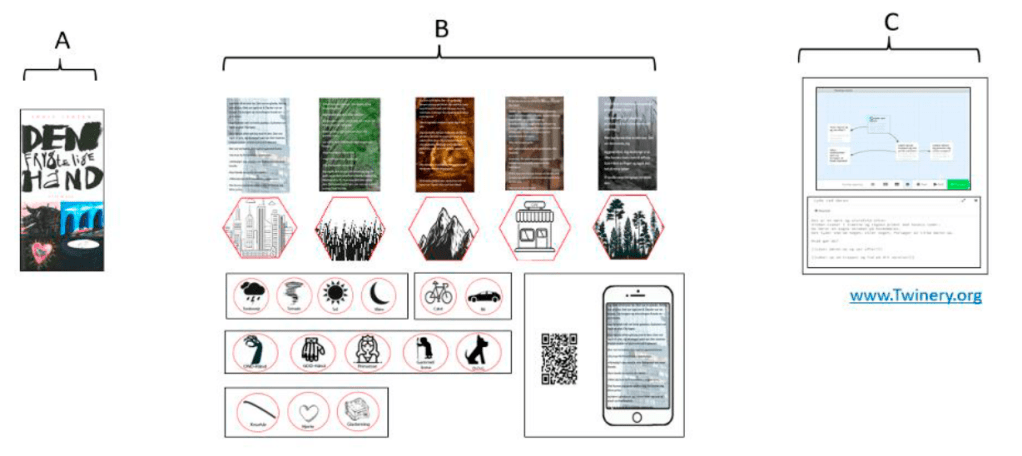 In the image, the pedagogical design is displayed. A is the starting point where students get a short read-out-loud from the beginning of a novel. In this case, it is “The Horrible Hand”, a fantasy novel. B represents the wooden pieces and the phase where students engage and collaborate on their stories. Finally C represents the process of creating their stories in Twine.